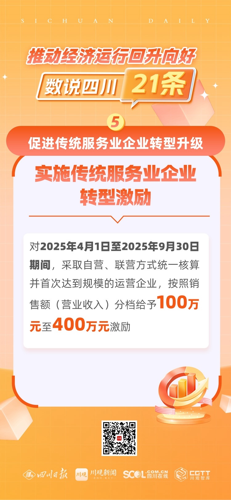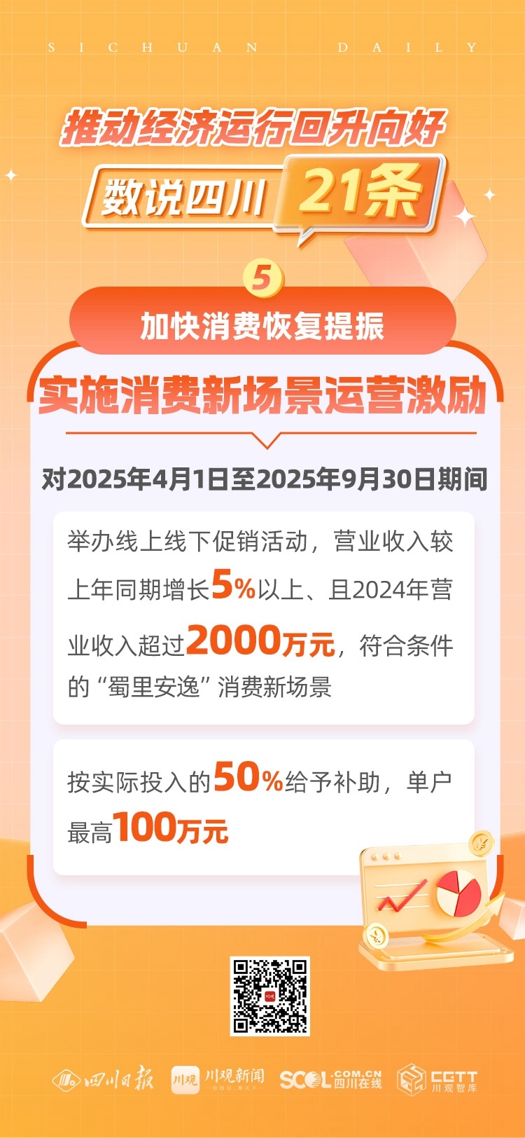 实施消费新场景运营激励。对2025年4月1日至2025年9月30日期间,举办线上线下促销活动,营业收入较上年同期增长5%以上、且2024年营业收入超过2000万元,符合条件的“蜀里安逸”消费新场景运营主体,省级财政按其促销活动实际投入的50%给予补助,单户最高100万元。
