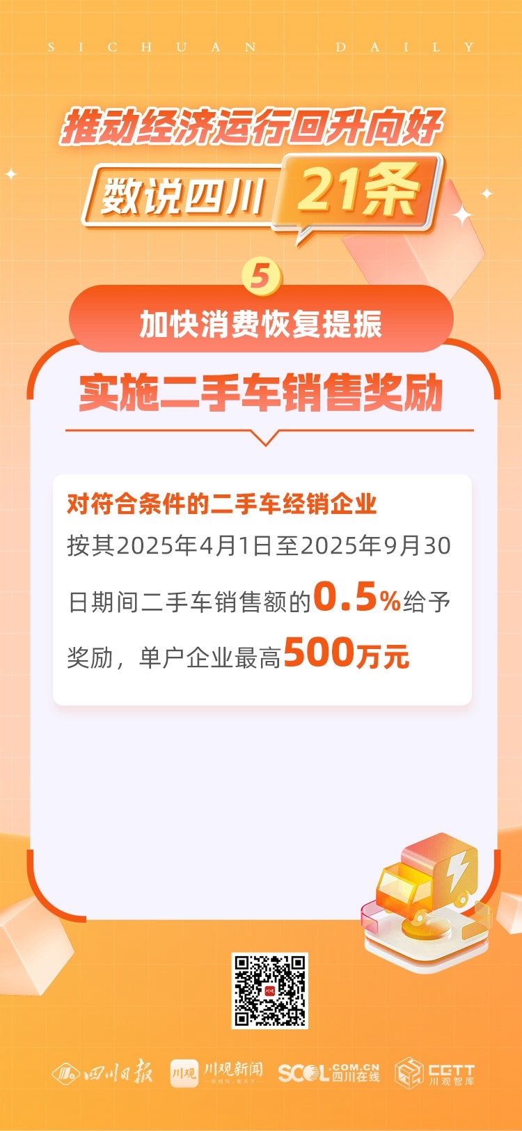 实施二手车销售奖励。对符合条件的二手车经销企业,按其2025年4月1日至2025年9月30日期间二手车销售额的0.5%给予奖励,单户企业最高500万元。