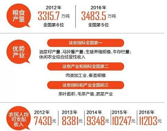 总书记指出,解决好吃饭问题始终是治国理政的头等大事。2016年,全川油菜籽总产量242.5万吨,连续15年创新高,并跃居全国第一;粮食也以总产3483.5万吨的成绩单,从全国第7位升至第5位。今年8月,我省更是率先在全国启动粮食生产功能区和重要农产品保护区“两区”划定。