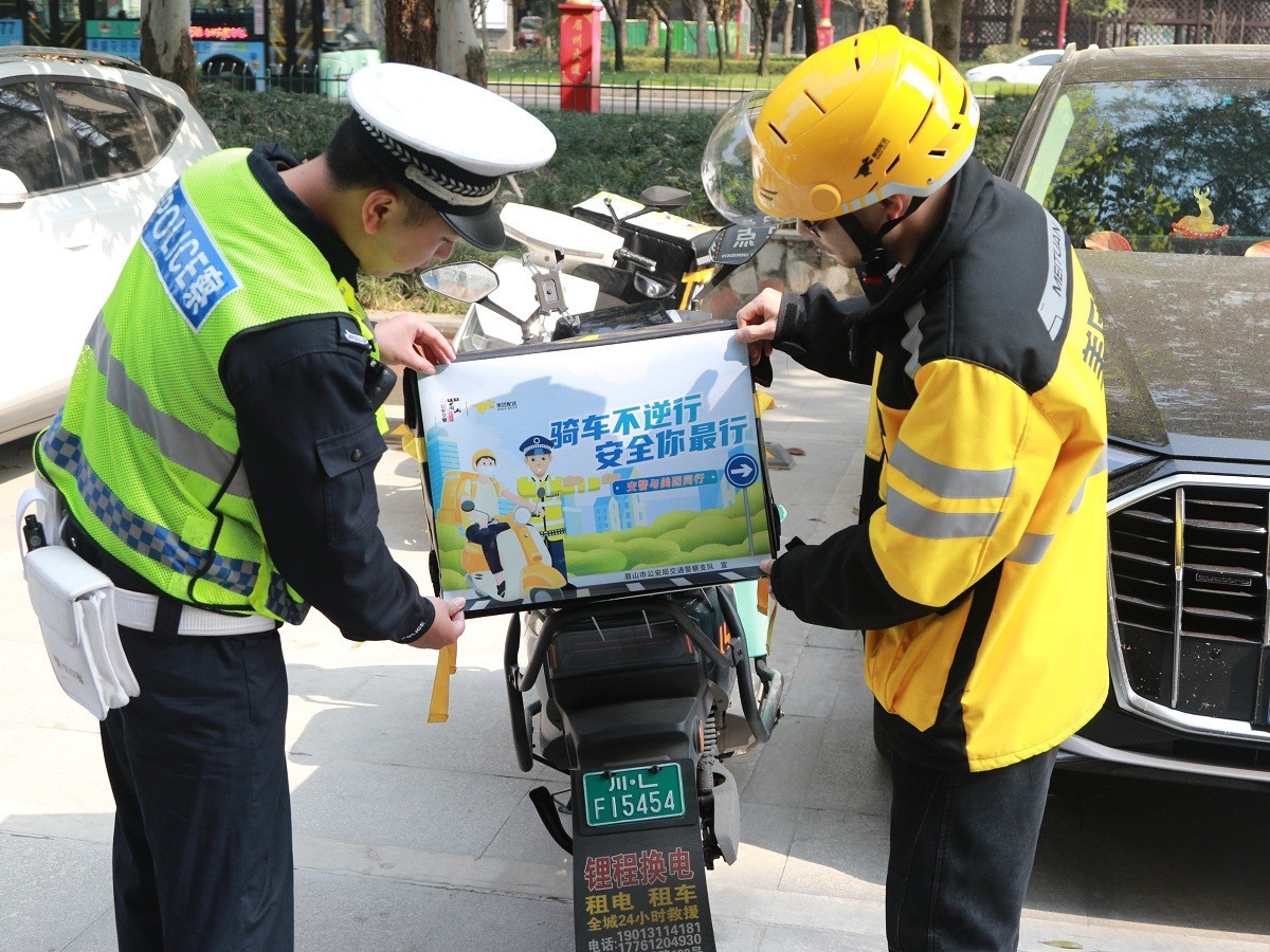 活动中,民警向骑手们普及道路交通安全知识及行车常识,教育劝导不戴安全头盔、乱停放、闯红灯、逆行等涉及配送行业常见的交通违法行为,还为骑手们送上暖心“交通安全餐”。