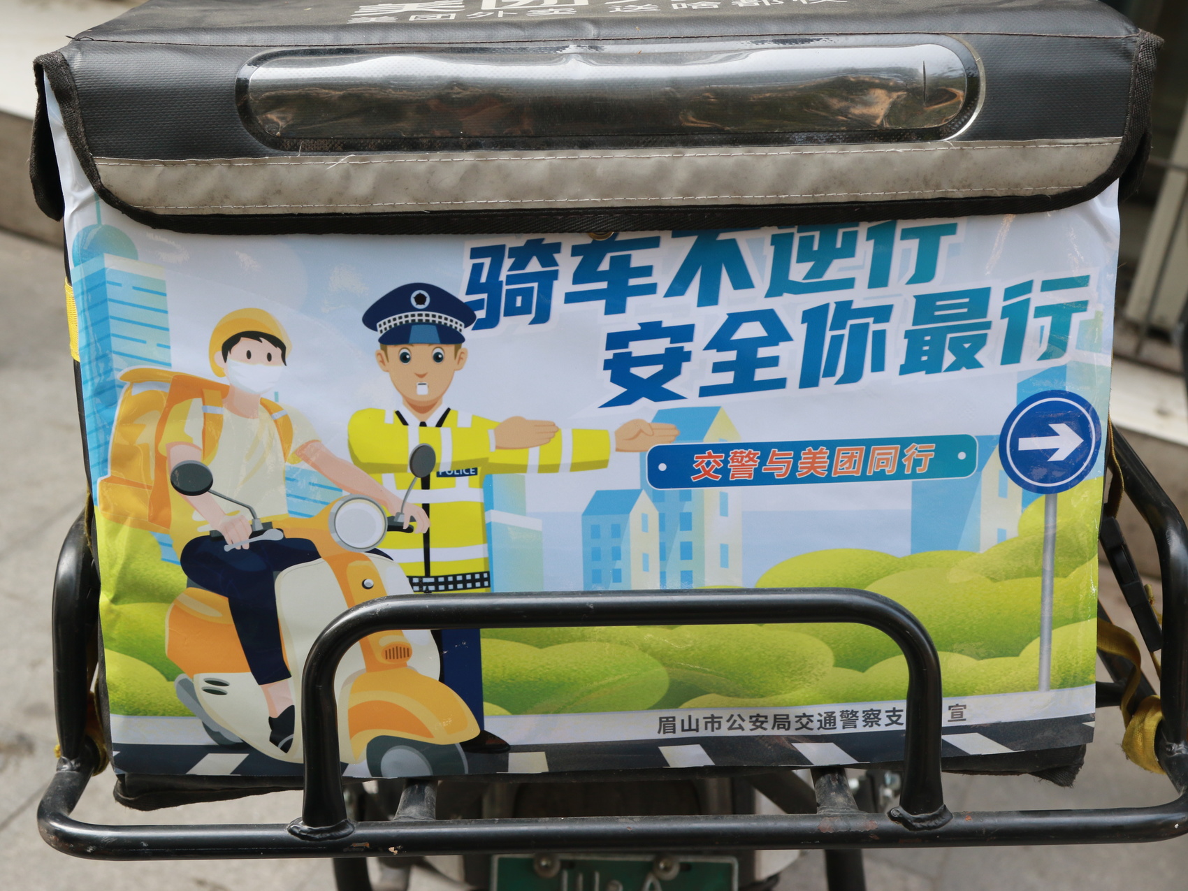 据了解,这是眉山公安交警联合美团外卖开展的“交通安全移动风景线”活动,通过在外卖配送箱张贴定制宣传标语,让流动的“小电驴”变身交通安全宣传站。