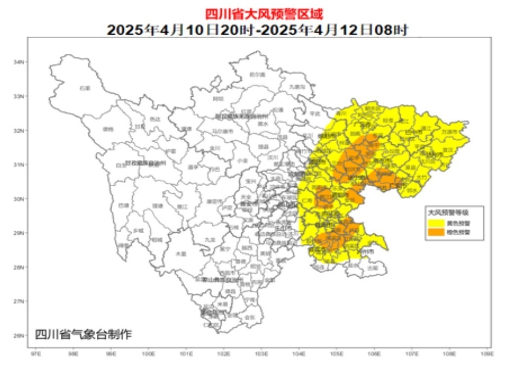 四川省气象台4月10日16时00分发布大风黄色预警:10日夜间,盆地部分地方有雷雨或阵雨,雷雨时伴有短时阵性大风等强对流天气。受冷空气影响,11日08时到12日08时,广元、巴中、南充、达州、遂宁、资阳、内江、自贡、宜宾、泸州10市和绵阳、德阳、成都3市东部有6—8级风,局部风力可达9级或以上,并伴有浮尘或扬沙。