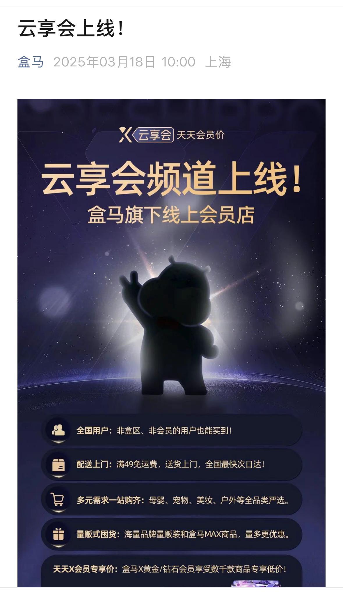 4月10日,盒马旗下“盒马云超”正式升级为“云享会”,面向全国用户,不住在“盒区房”、非盒马X会员的用户也可线上下单购买近4000款商品。该项升级已基本实现全国覆盖。盒马X会员用户可享受“天天会员价”及全年无限次满49元免邮到家的服务。这次升级,距上次盒马云超宣布扩大配送范围仅过去三个月。