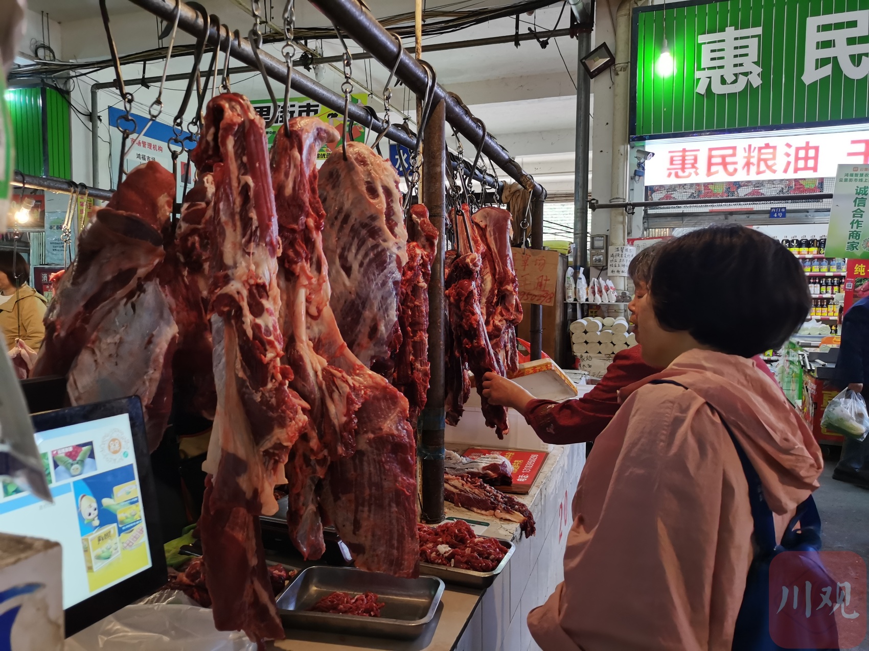 在市场内展示的一块显示屏上,滚动着接入平台的摊位实时销售数据,随着数字的不断跳动,当天鸿福农贸市场的早市情况也随着显现——从品类来看,新鲜肉类是市民早上购买的热门品类,占到销售总量的64.81%,新鲜蔬菜、调味品和海水产类则销量相当,分别在早市销量的10%上下浮动,购买米面粮油的较少,仅占销售总量的5.56%。从商品单量来看,牛肋条、散养鸡、牛里脊为早市销售最多的三个单品,不同摊位的市场价格基本一致,蒜苔、大青椒、莴笋紧跟其后,成为蔬菜类的销量“冠军”,其中,蒜苔的最高价和最低价相差2元,莴笋单价则相差0.4元。