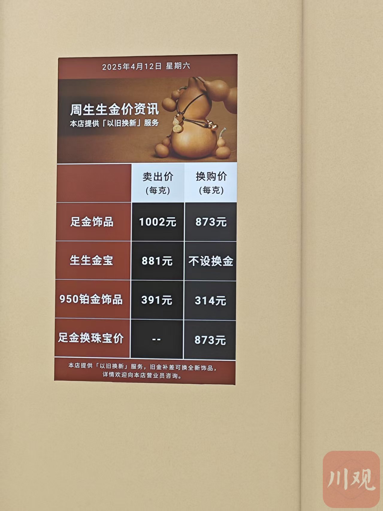 “哇,你们这边都已经突破1000元了,比我们这边贵了12元。”4月12日10点过,成都群光广场周大福专柜工作人员站在周生生专柜的金价资讯前忍不住发出惊呼。此时周生生足金饰品卖出价每克为1002元,已经突破千元大关。