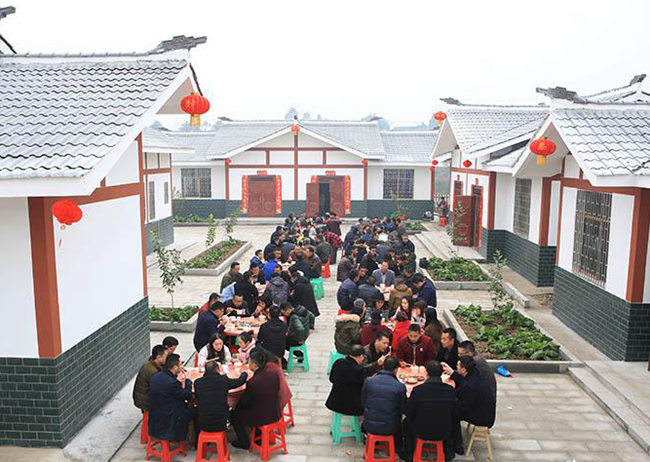 2017年,广安市广安区白马乡白马村易地扶贫集中安置点贫困群众与前来贺喜的亲朋好友集体过春节。