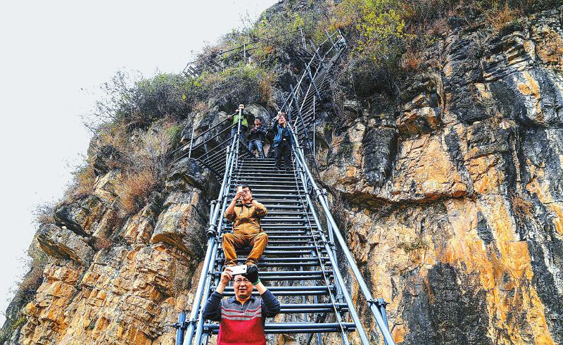 游客们坐在钢梯上拍摄悬崖村的自然美景。川报观察记者 吴传明 摄