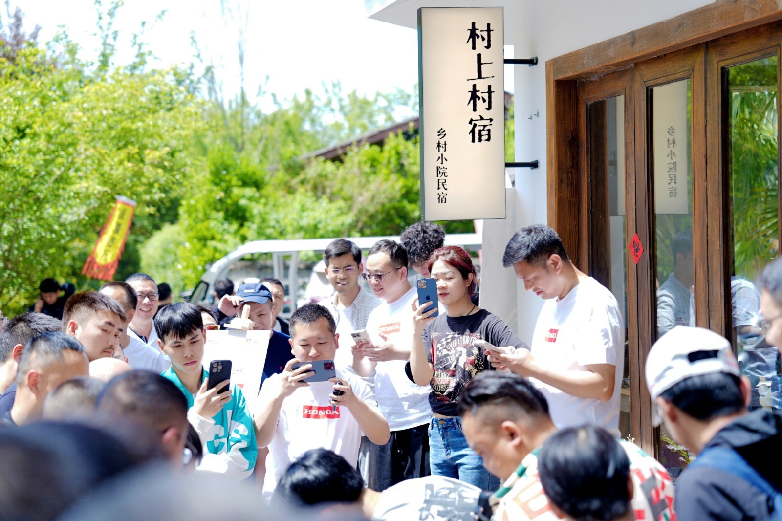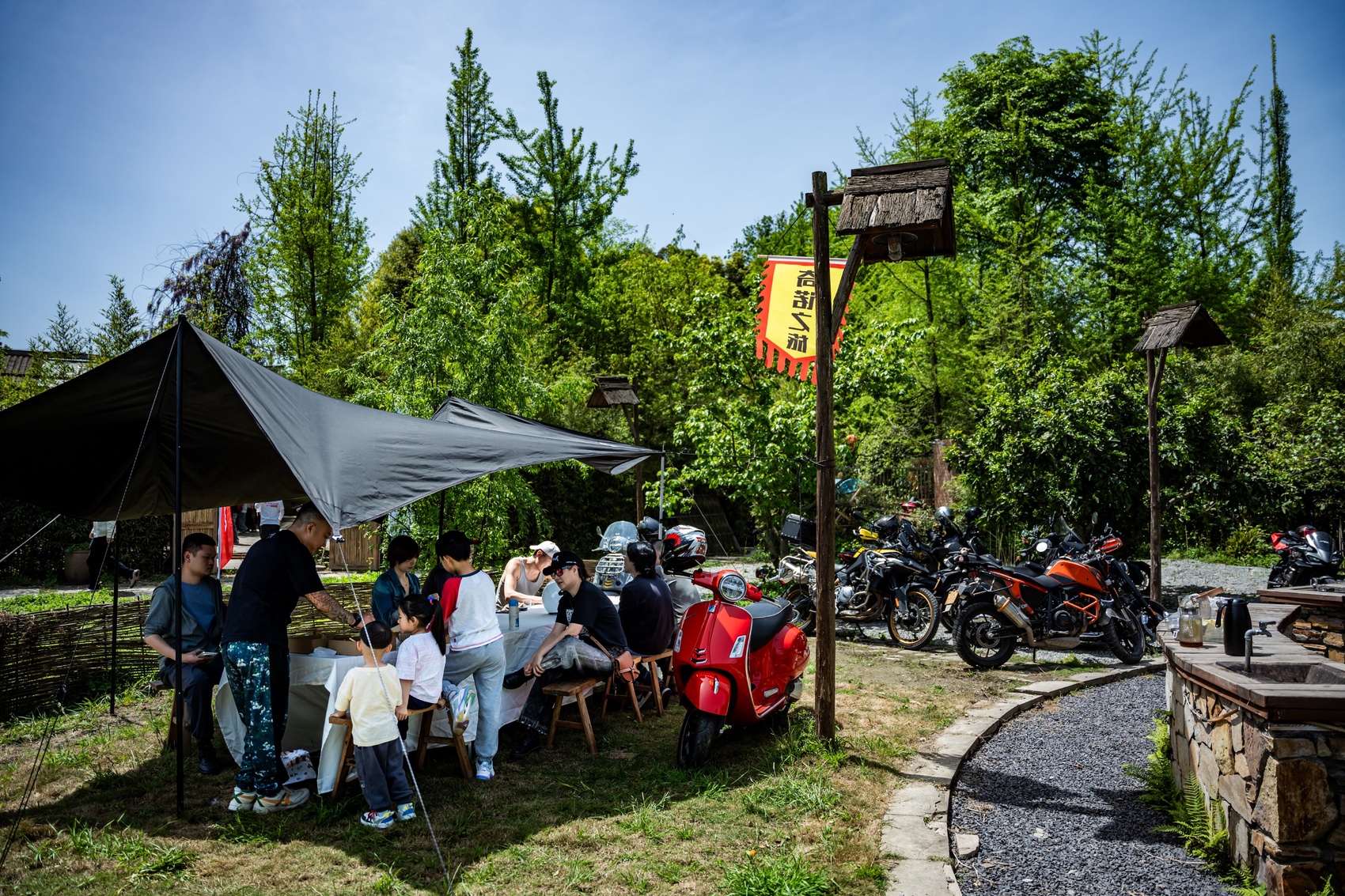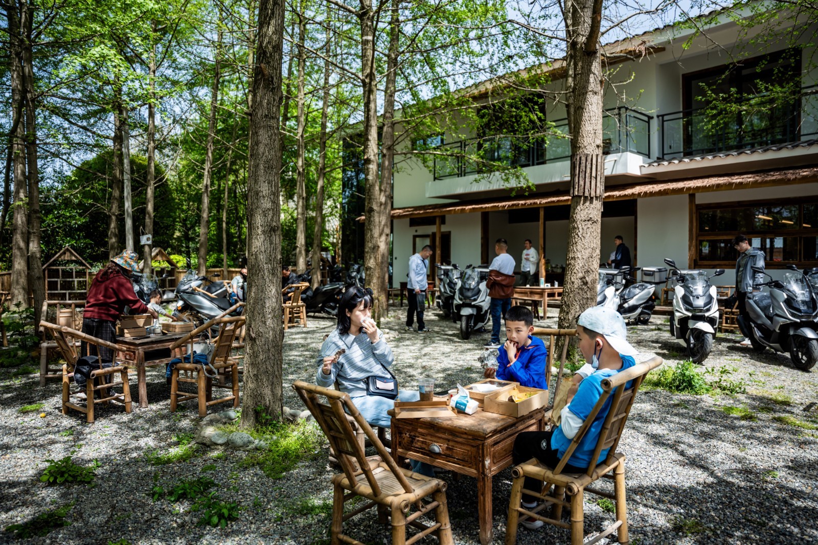 在林盘院落改造的“村上村宿”综合体,机车手们分散在留灯书舍的禅意空间、亲邻坊乡村茶馆的烟火气里。中午12时,张冬梅带着20多位“共享厨娘”端出热气腾腾的蒸笼宴、定制烧烤,“400人的订单,腊肉是自家熏的,蔬菜现摘现炒,这才是真正的从田间到餐桌。”作为游客中心运营人员,她见证了通过“村集体出场地、企业出资金、村民出劳力”的“三点”模式。一年多来,村上多个闲置农房盘活为网红消费场景。