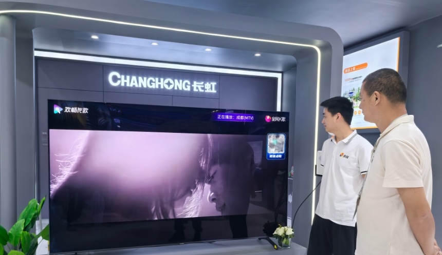 消博会四川馆内,长虹百吋AI TV强势吸睛。现场工作人员介绍,作为AI TV系列产品之一,长虹百吋AI TV搭载智慧家电AI平台——长虹云帆,同时接入DeepSeek,并融合字节跳动、科大讯飞、商汤等企业的大模型,可通过角色、情节搜索节目,也能通过节目类型搜索正在播放的直播节目,破解用户无法精准搜索的使用痛点。