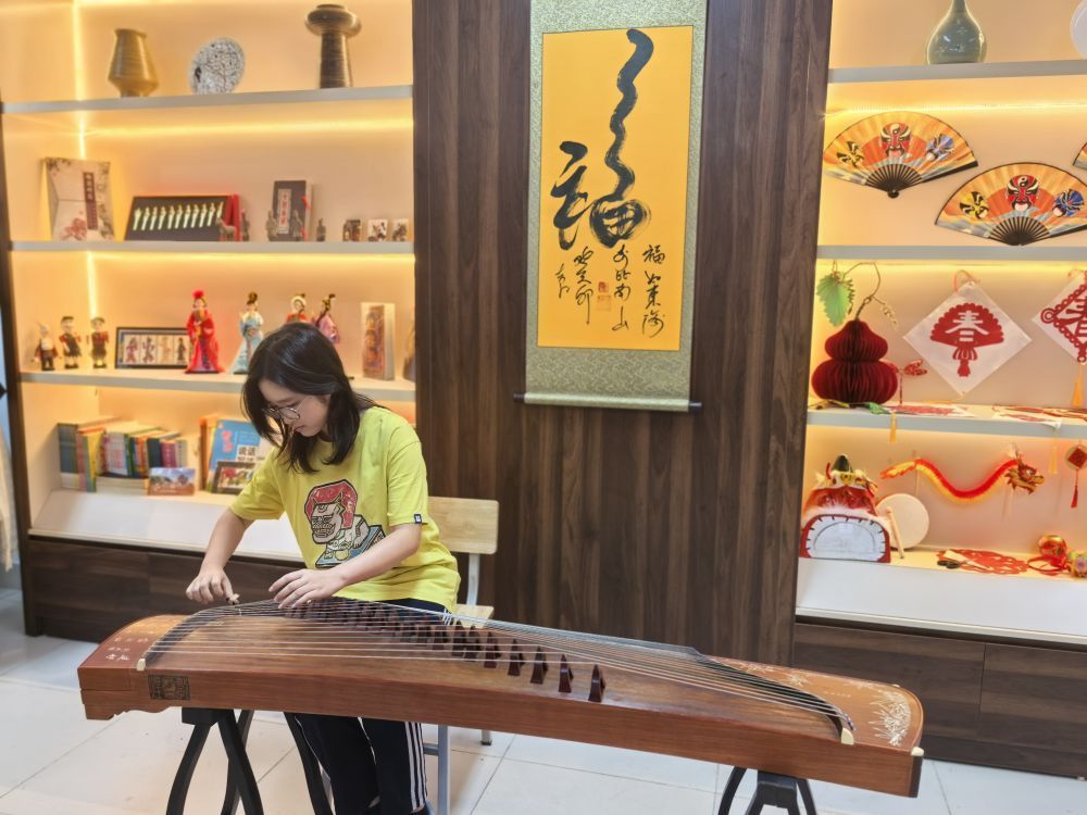 3月29日,越南河内—阿姆斯特丹高中“越中文化室”正式启用。该校高三学生阮霞英端用古筝弹奏《女儿情》。河内中国文化中心供图