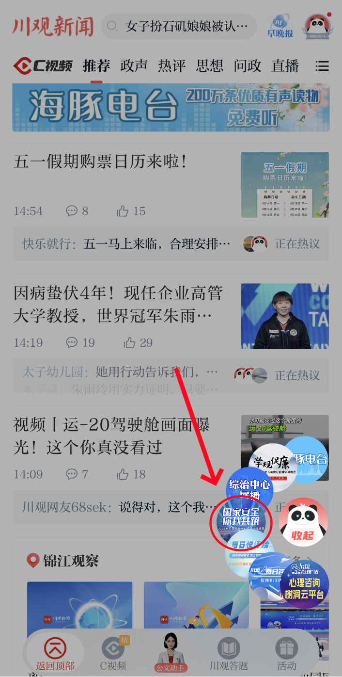 方式一:在川观新闻首页,点击右下方悬浮球,找到“国家安全 你我共筑”活动图片点击参与;