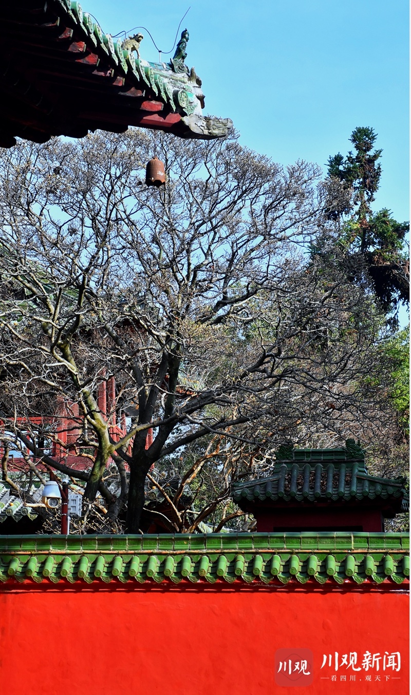 1月3日,绵阳市平武县县城的报恩寺,红墙碧瓦在蓝天白云下显得格外漂亮。有着北京故宫建筑风格的报恩寺内古木参天,飞檐凌空,金黄色的琉璃瓦在阳光下发光。