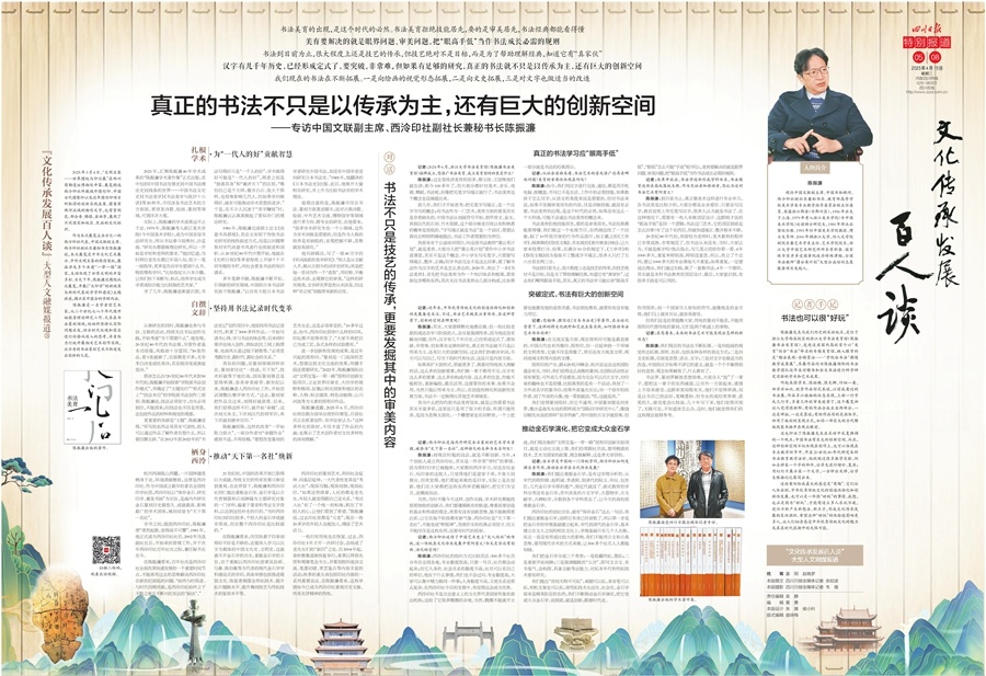 四川日报全媒体“文化传承发展百人谈”大型人文融媒报道持续推出,今日《四川日报》连版推出第七十八期,专访中国文联副主席、西泠印社副社长兼秘书长陈振濂。