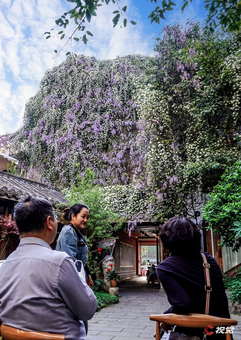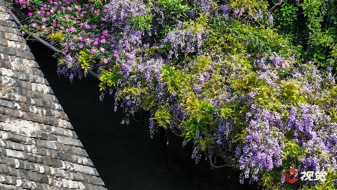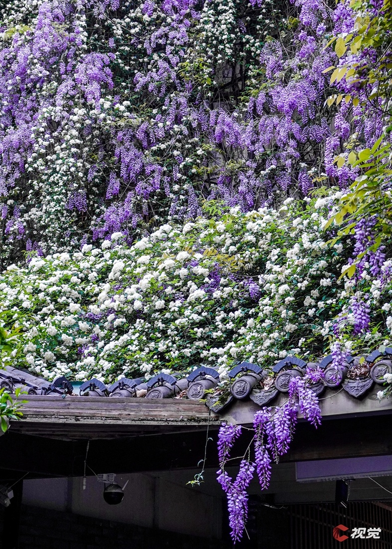 4月9日,位于成都市白果林的市井老巷内,繁茂的紫藤花与七里香交织在一起,汇成紫白色的花瀑,从屋顶倾泻而下。(C视觉 杨容生 摄)