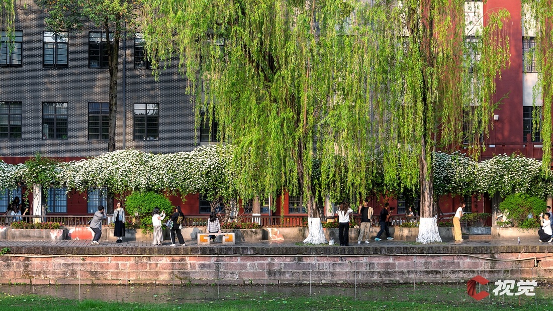 4月9日,四川大学望江校区的七里香花开正盛,铺满整个长廊,无数学生前来打卡拍照,定格春色。(C视觉 杜宁 摄)
