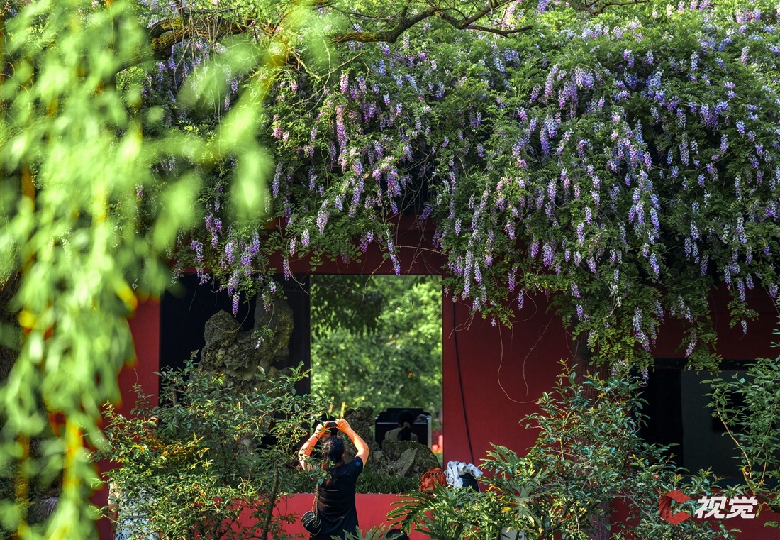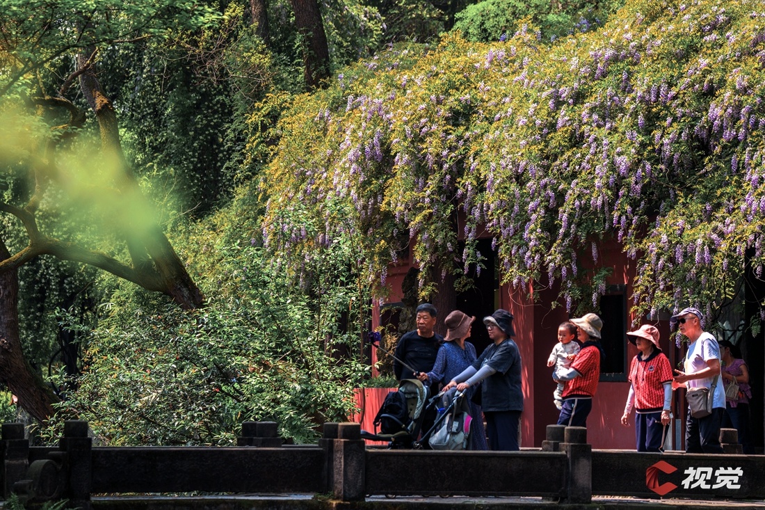 4月12日,成都市青白江区城厢古城,家珍公园陈家祠堂内的紫藤绽放。(C视觉 周琦 摄)