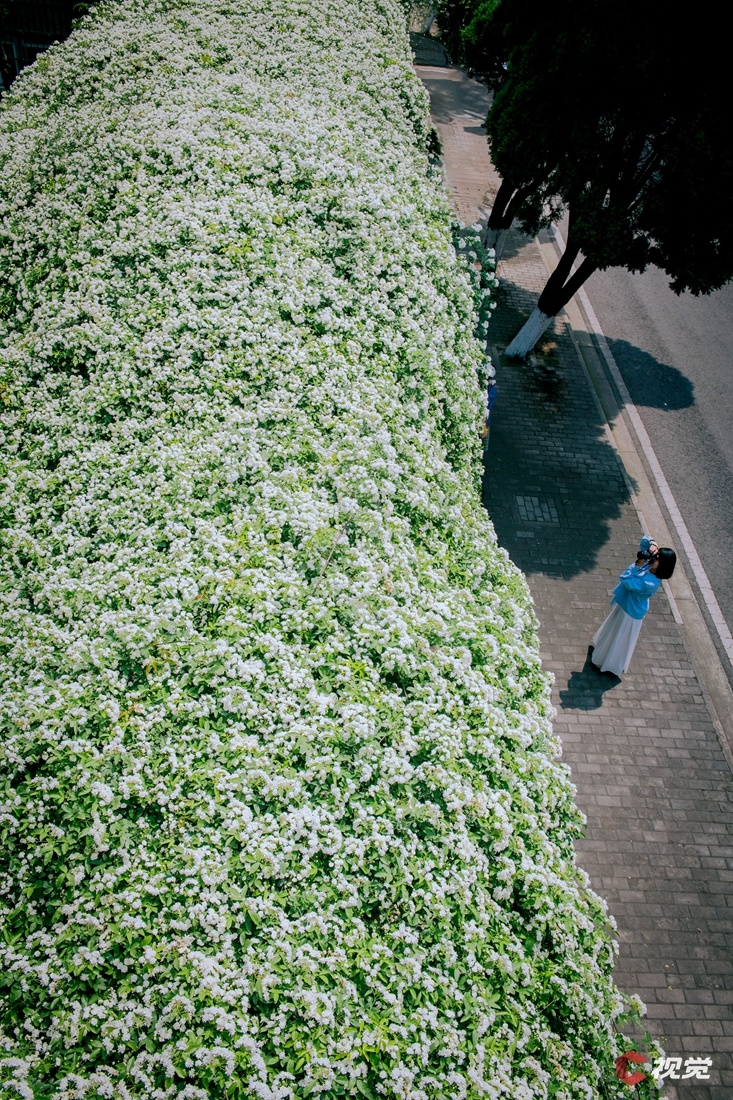 4月13日,绵阳市南山中学外的几百米道路被七里香花海环绕,成为热门打卡地。(C视觉 张祖强 摄)