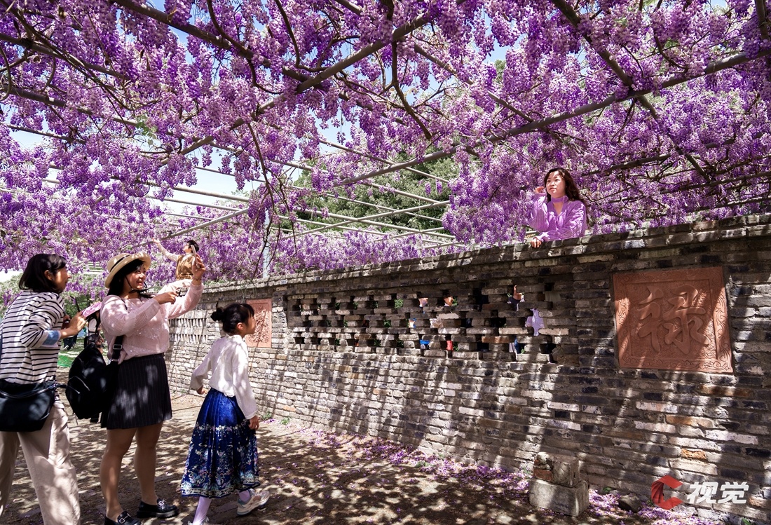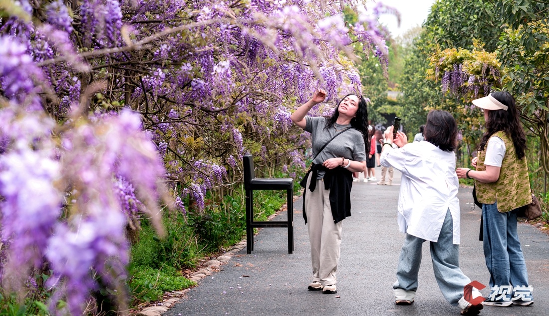 4月13日,成都市新都区芳华微马公园的紫藤长廊,梦幻的紫色花簇从廊顶垂落,游人纷纷在花下打卡拍照。(C视觉 李佳 摄)