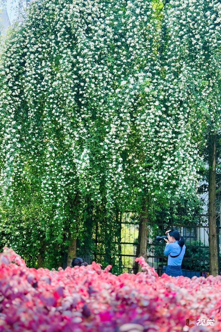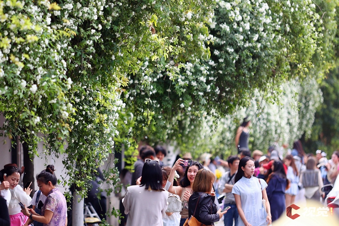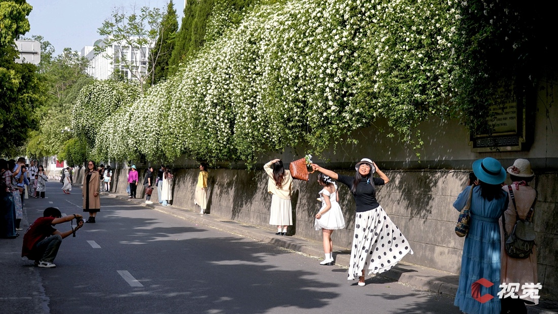 4月11日,绵阳市涪城区南山中学外的几百米道路十分热闹,盛放的七里香吸引众多市民前来打卡拍照。(C视觉 陈冬冬 摄)
