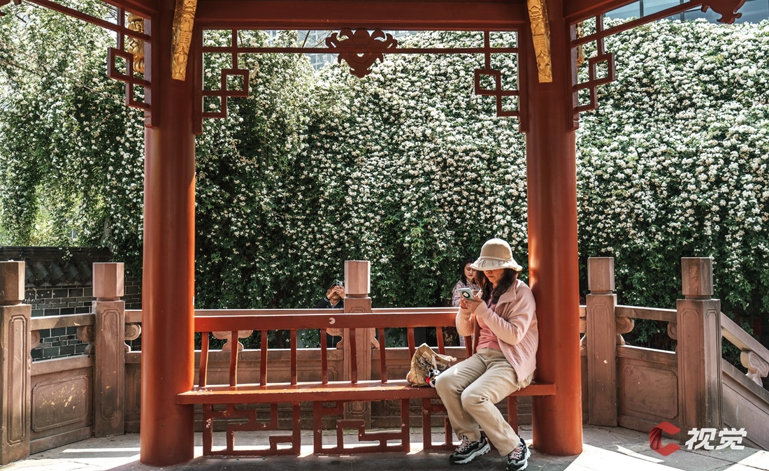 4月9日,成都市琴台路牌楼下的街角处,白色的七里香花开满墙,路过市民纷纷驻足拍照。(C视觉 李佳 摄)