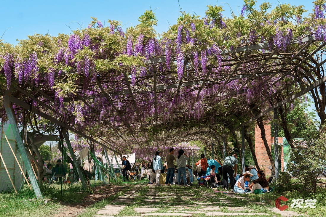 4月10日,崇州市怀远镇三官村,慕藤月鲜花农场的紫藤长廊化身为一条紫色隧道,吸引不少游客前来观赏游玩。(C视觉 李旭 摄)