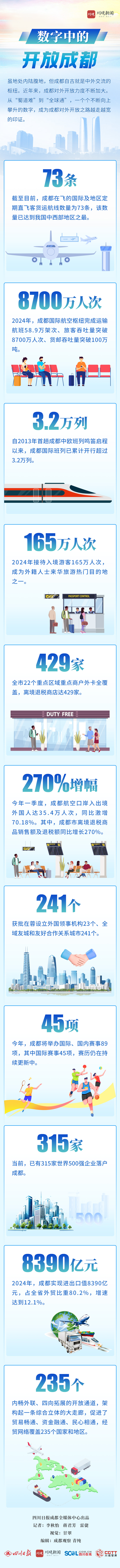 虽地处内陆腹地,但成都自古就是中外交流的枢纽。近年来,成都对外开放力度不断加大。从“蜀道难”到“全球通”,一个个不断向上攀升的数字,成为成都对外开放之路越走越宽的印证。