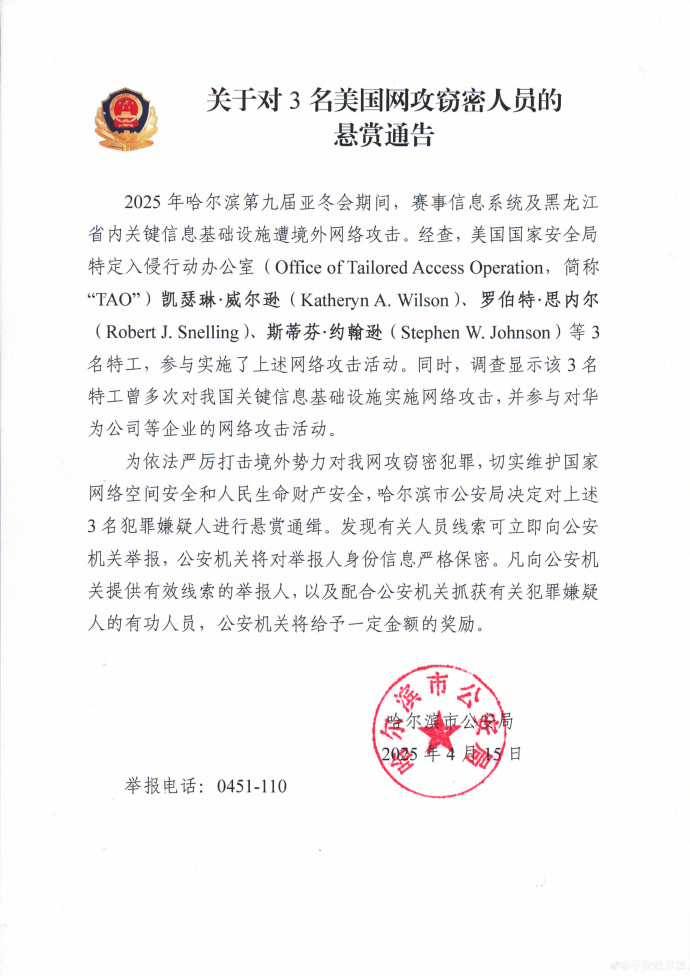 这3人在今年2月哈尔滨第九届亚冬会期间,在境外对赛事信息系统等进行网络攻击,所以被悬赏通缉。