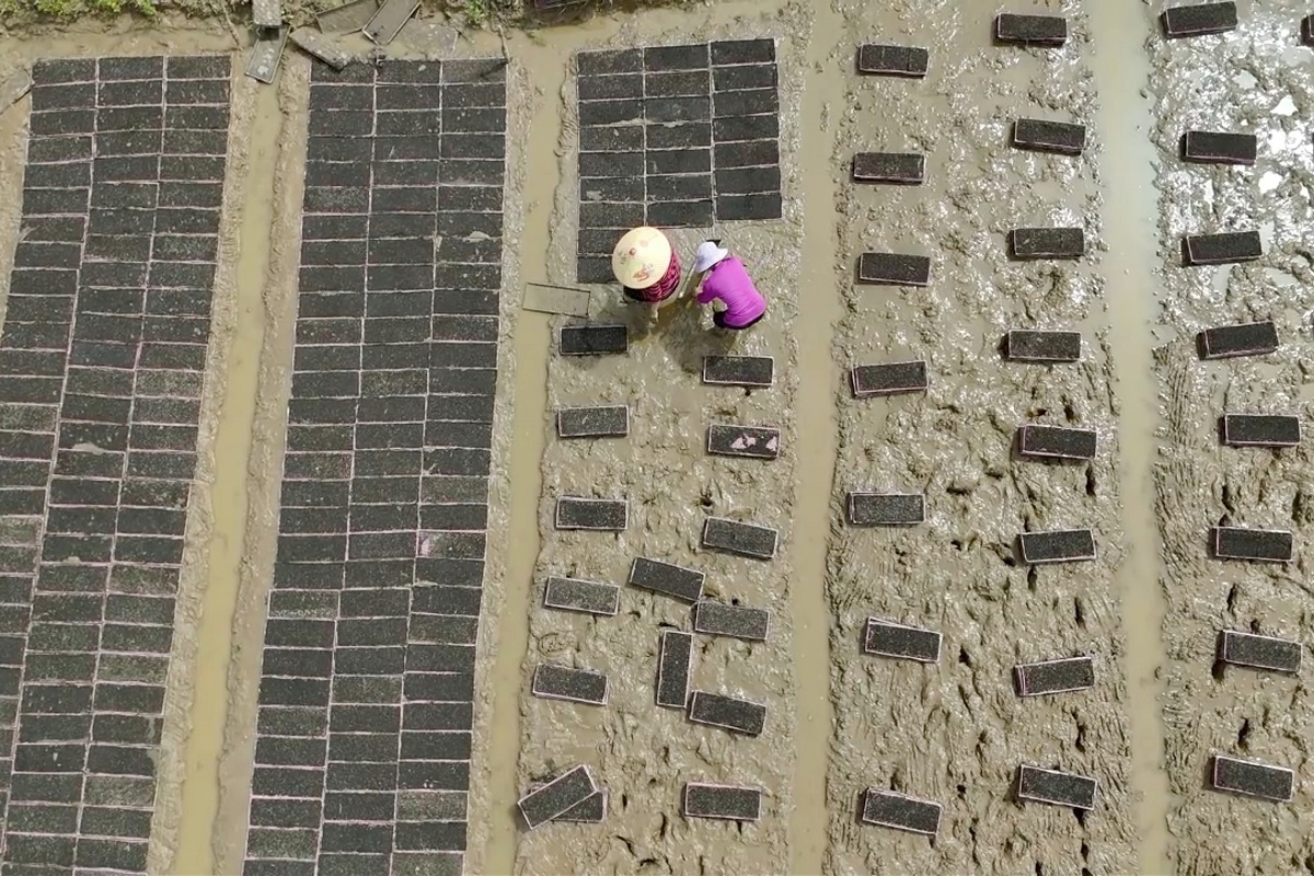 另外一边,经过催芽后的一盘盘秧盘抵达位于黎雅镇兰花村的试验田,村民们将标准化的秧苗盘放置在水田里。李永林介绍:“这些放在田里等着出3片叶子,差不多半个月的时间,就可以拿出来进行用插秧机插秧了。”