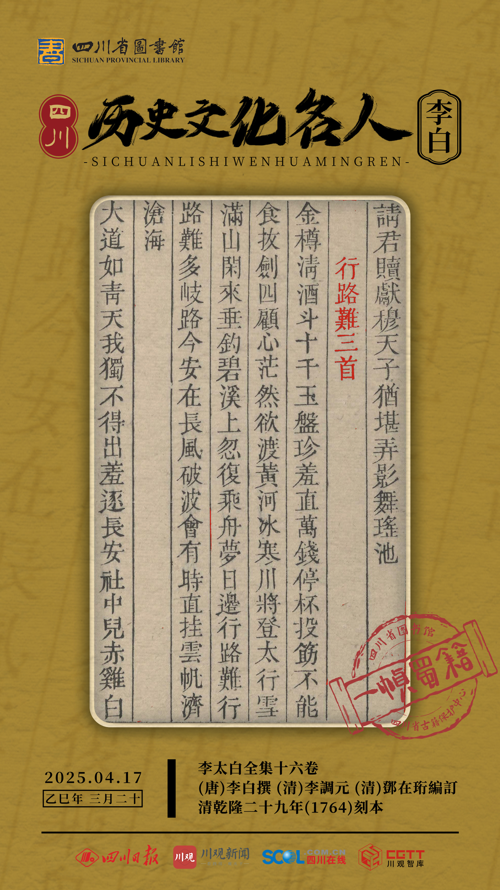 4月17日,一帧蜀籍邀您欣赏《李太白全集》。海报所选用图为《李太白全集》十六卷,由(唐)李白撰,(清)李调元(清)邓在珩编订。版本为清乾隆二十九年(1764)刻本。