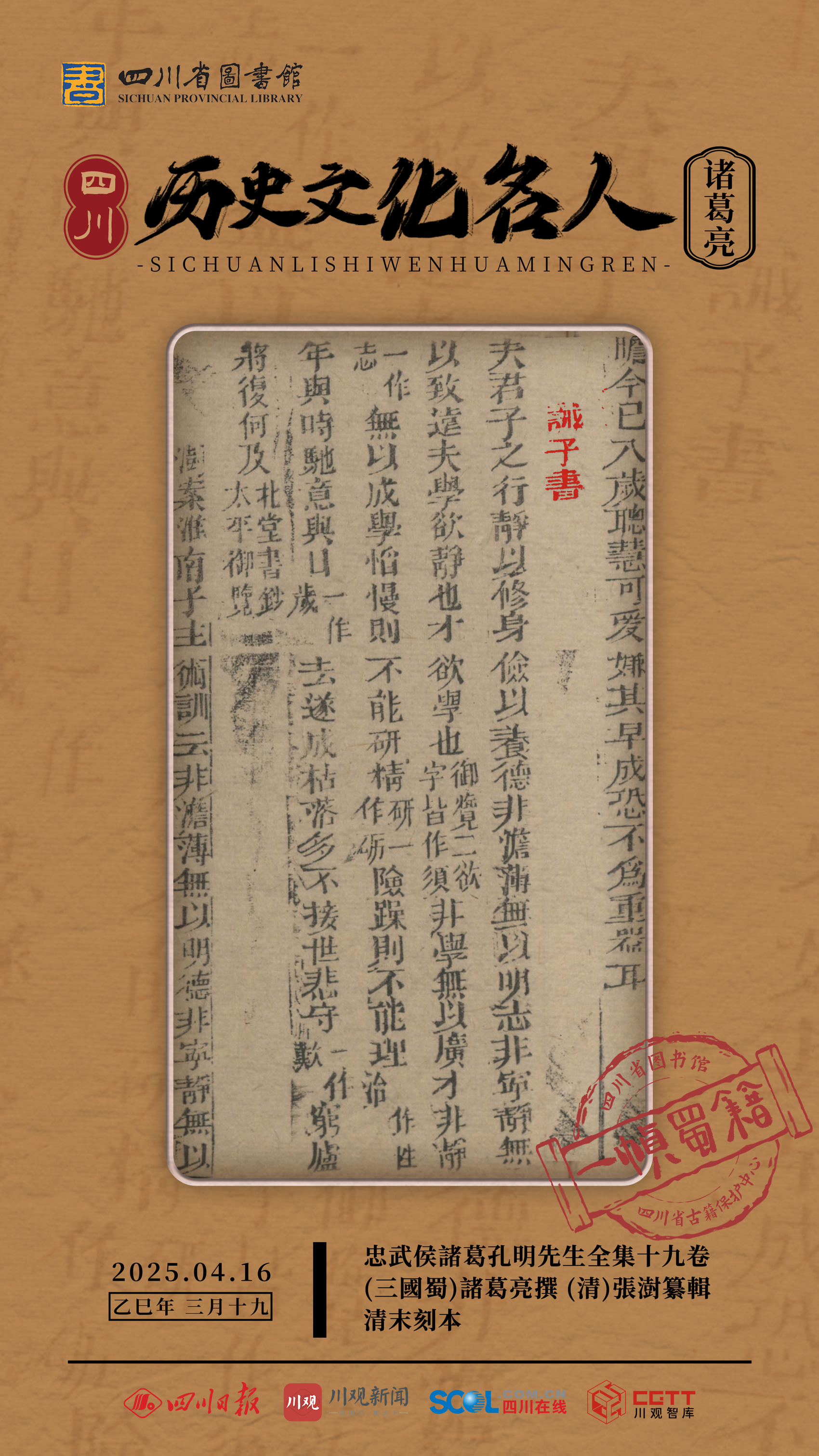 4月16日,一帧蜀籍邀您欣赏《忠武侯诸葛孔明先生全集》。海报所选用图为《忠武侯诸葛孔明先生全集》19卷,由(三国蜀汉)诸葛亮撰,(清)张澍纂辑。版本为清末刻本。