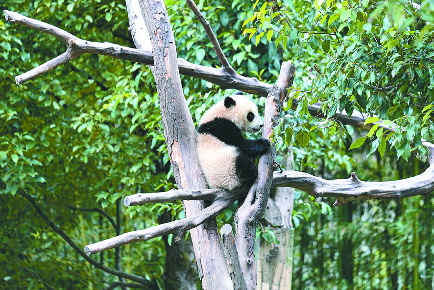 在中国大熊猫保护研究中心卧龙神树坪基地,大熊猫幼崽在树上休憩。新华社记者辛梦晨摄