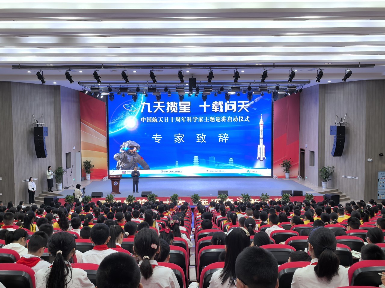这样澎湃的“追星”场景在资阳8个机关单位和校园同时上演:“航天点燃梦想”“中国航天员的选拔与训练”“茫茫太空‘放风筝’——航天器飞行控制解密”……6名我国航天领域的“巨星”,用一场场讲座点燃了青少年的航天梦。