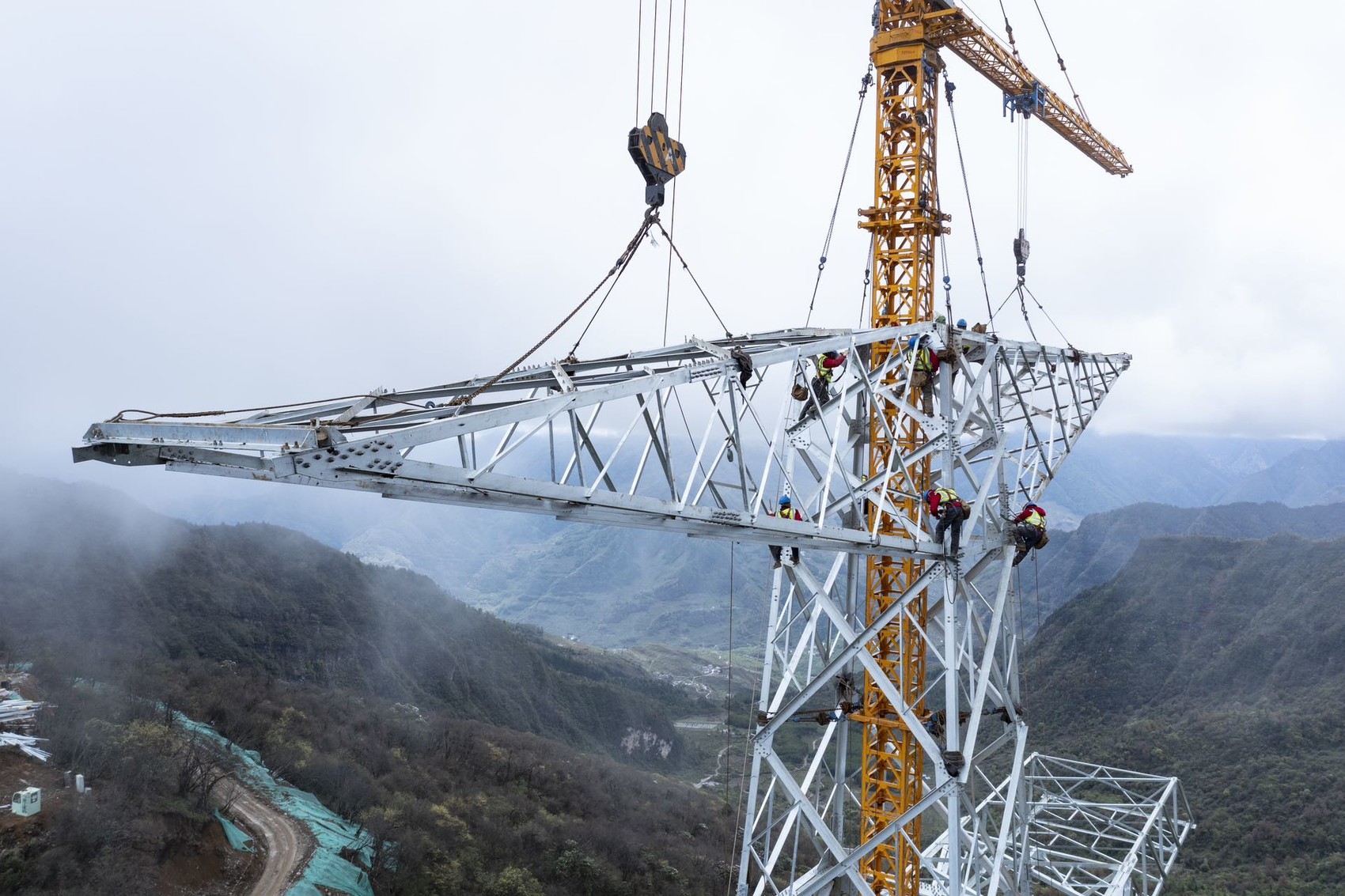 金上至湖北特高压工程牛背山段组塔施工作业。田海 摄