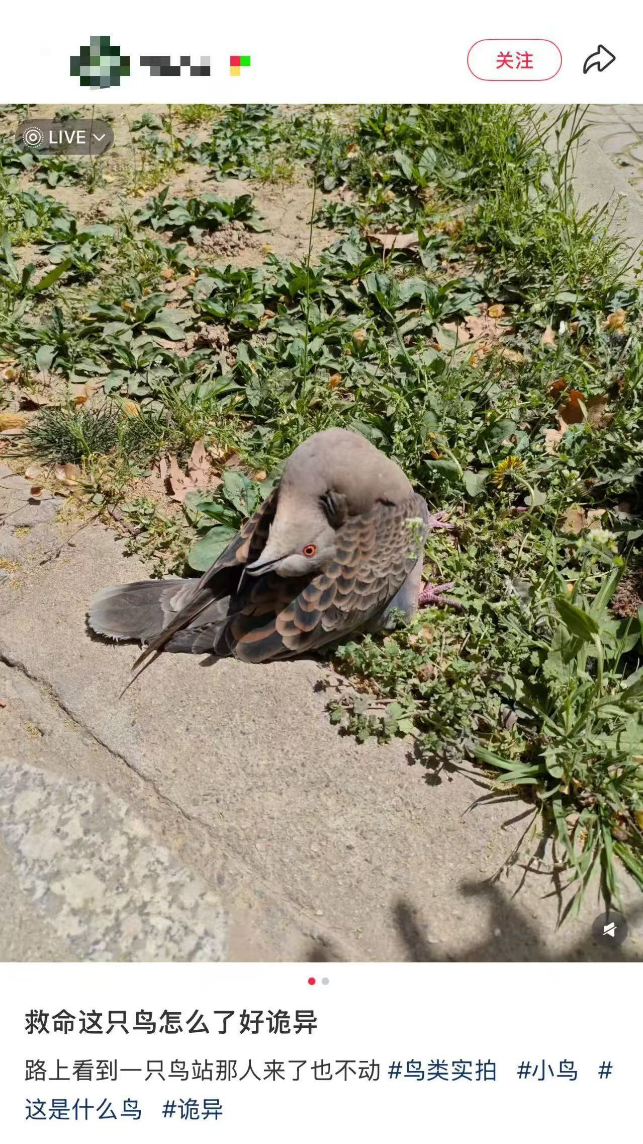 近日,有网友在社交媒体发帖,称在路上遇到一只“姿势诡异”的鸟类,人靠近了也不动。从发布的照片看,网友遇到的鸟脖子向上扭转了180度,头部后仰,呈望天状的姿势。不少网友留言表示,自己也曾在鸽子、家养鸡中发现过类似的症状。