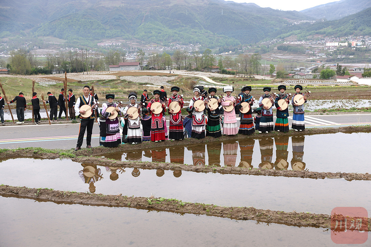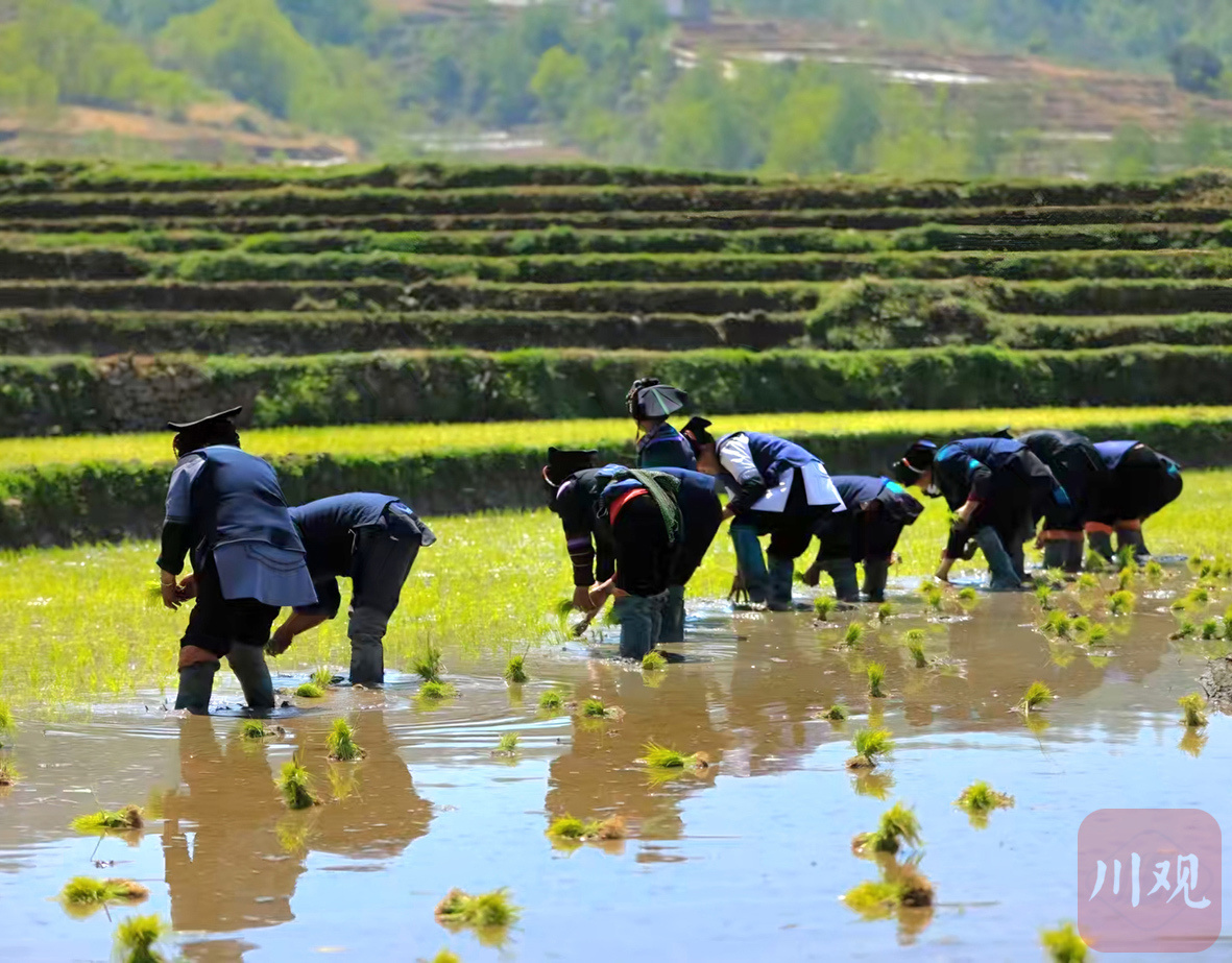 4月14日,越西县普雄镇阳坡村,村民身着传统服饰,在梯田旁举行祭祀仪式开启春耕。