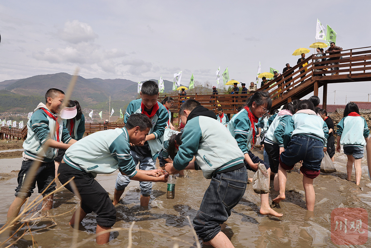 小学生在村民的指导下,感受传统农耕的艰辛与乐趣。