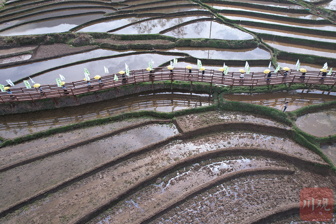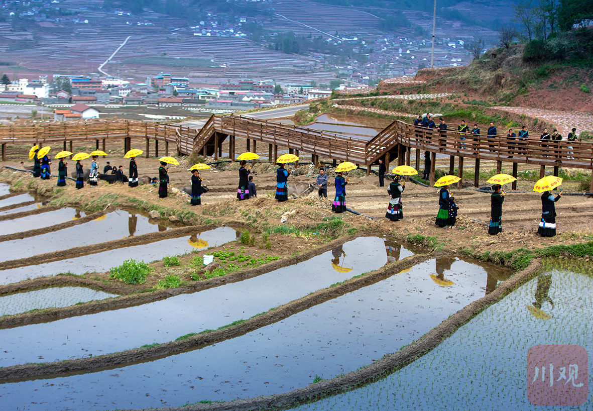 彝族同胞们身着传统服饰,齐聚在梯田旁。