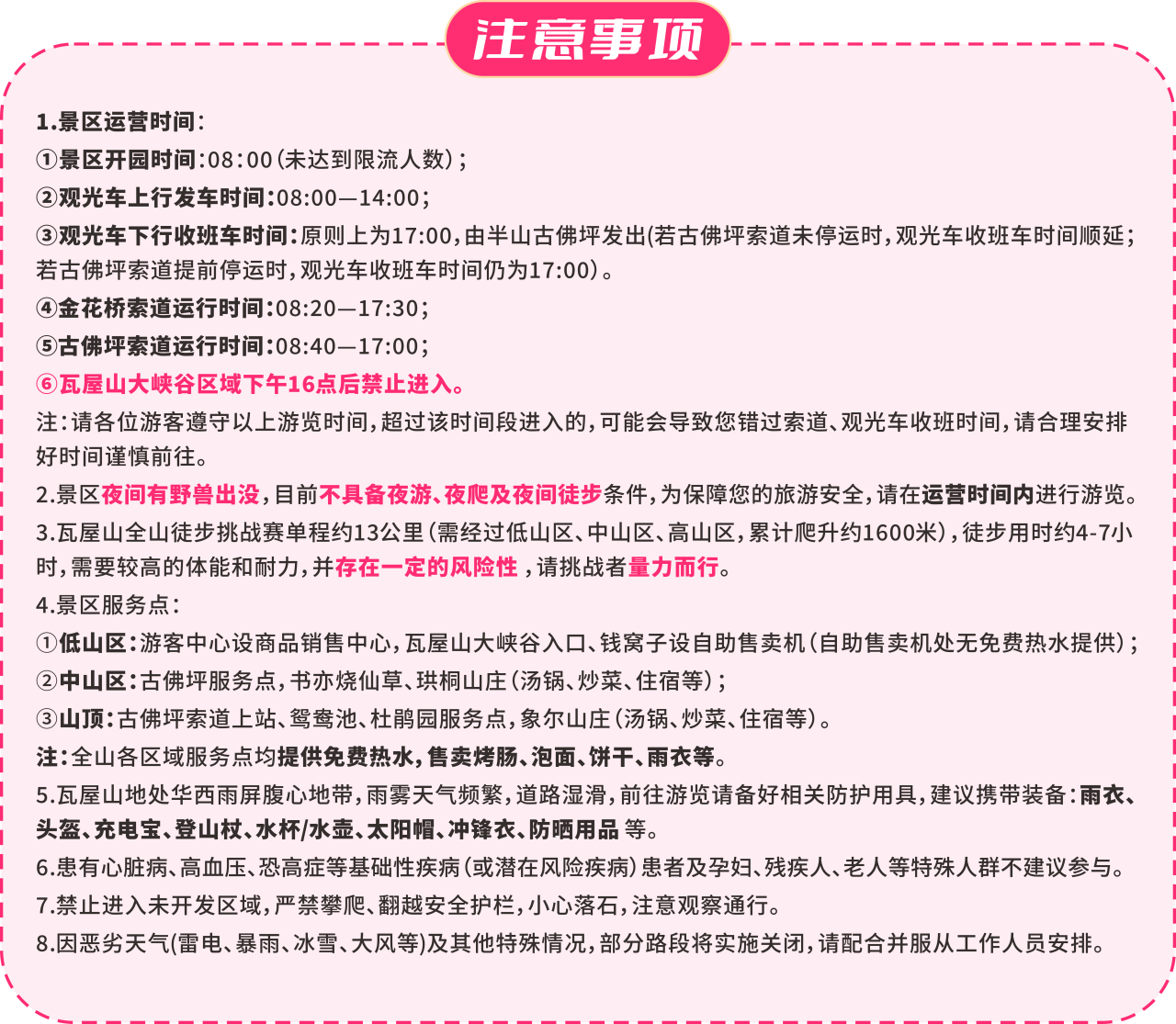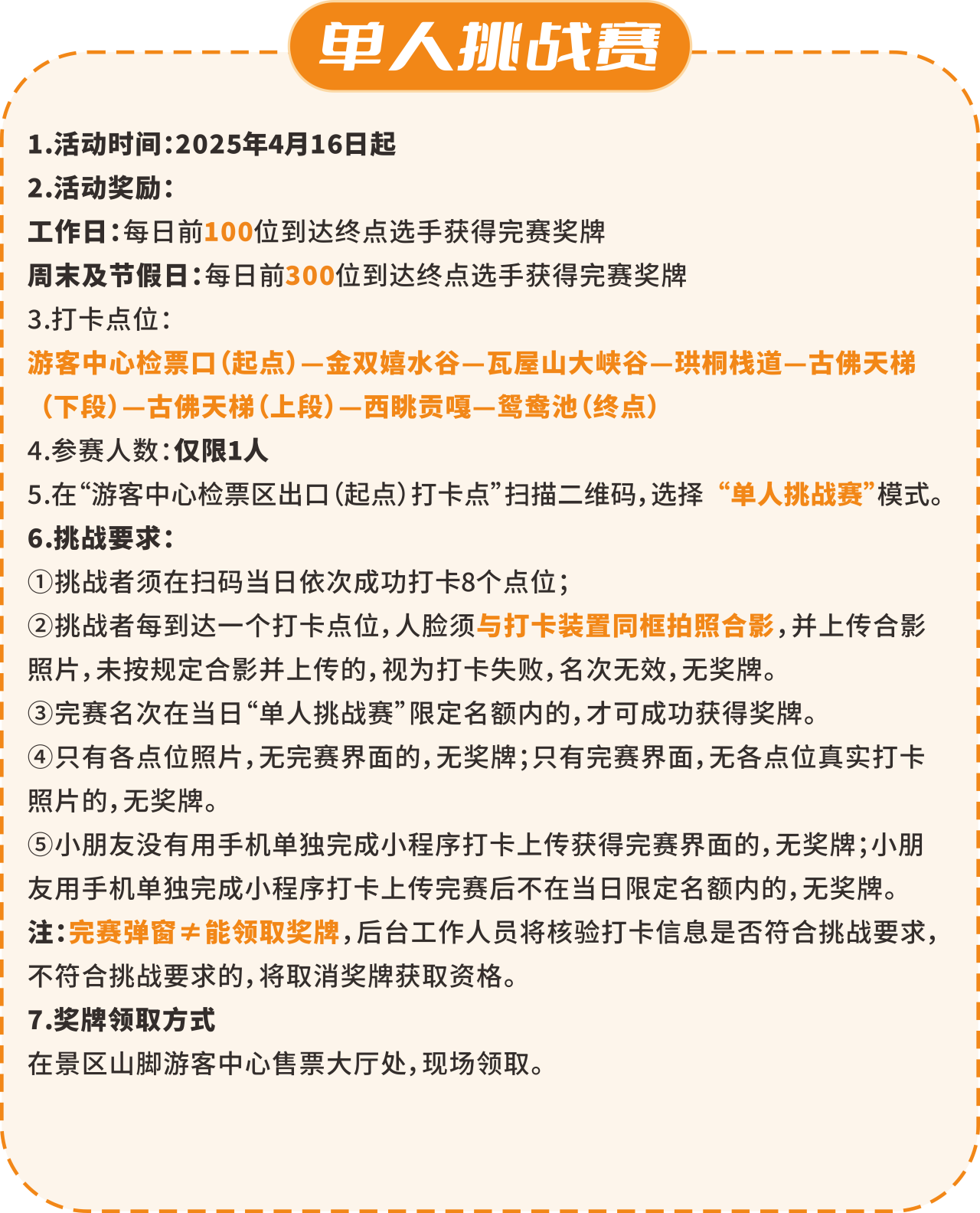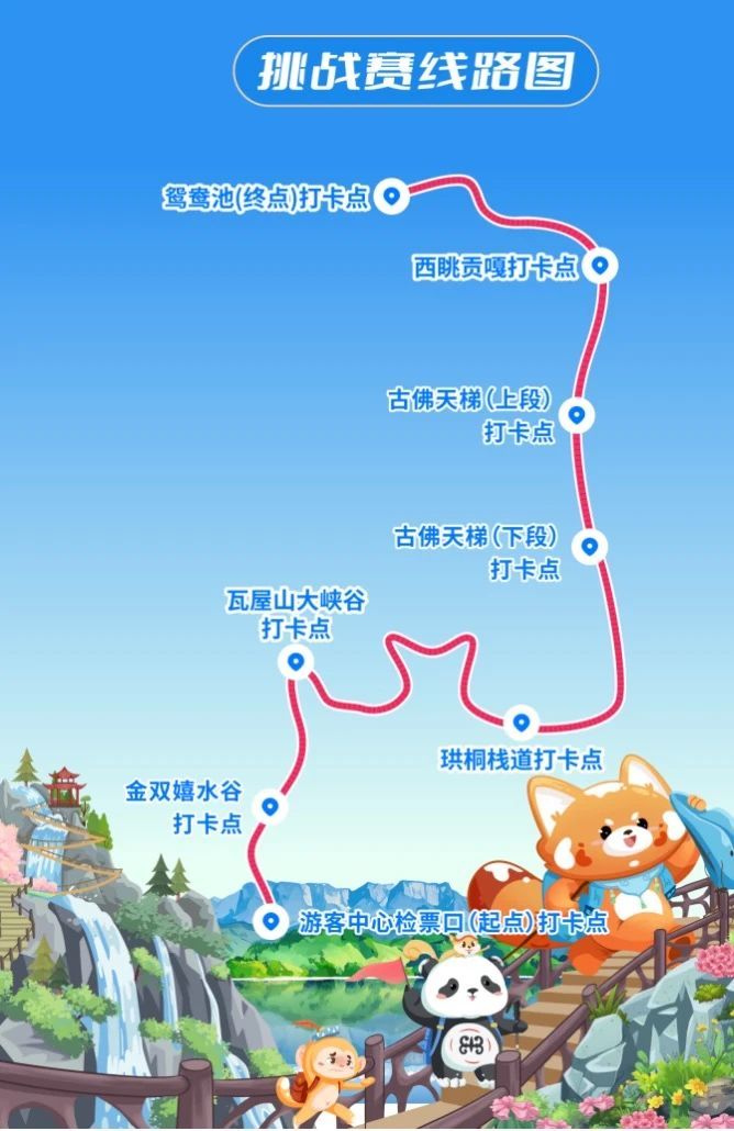此次徒步挑战赛路线起点为游客中心,途径瓦屋山大峡谷、古佛天梯等核心景点,终点为瓦屋山顶鸳鸯池,最高海拔约2830米,全程约13KM,徒步大约需要4—6个小时。