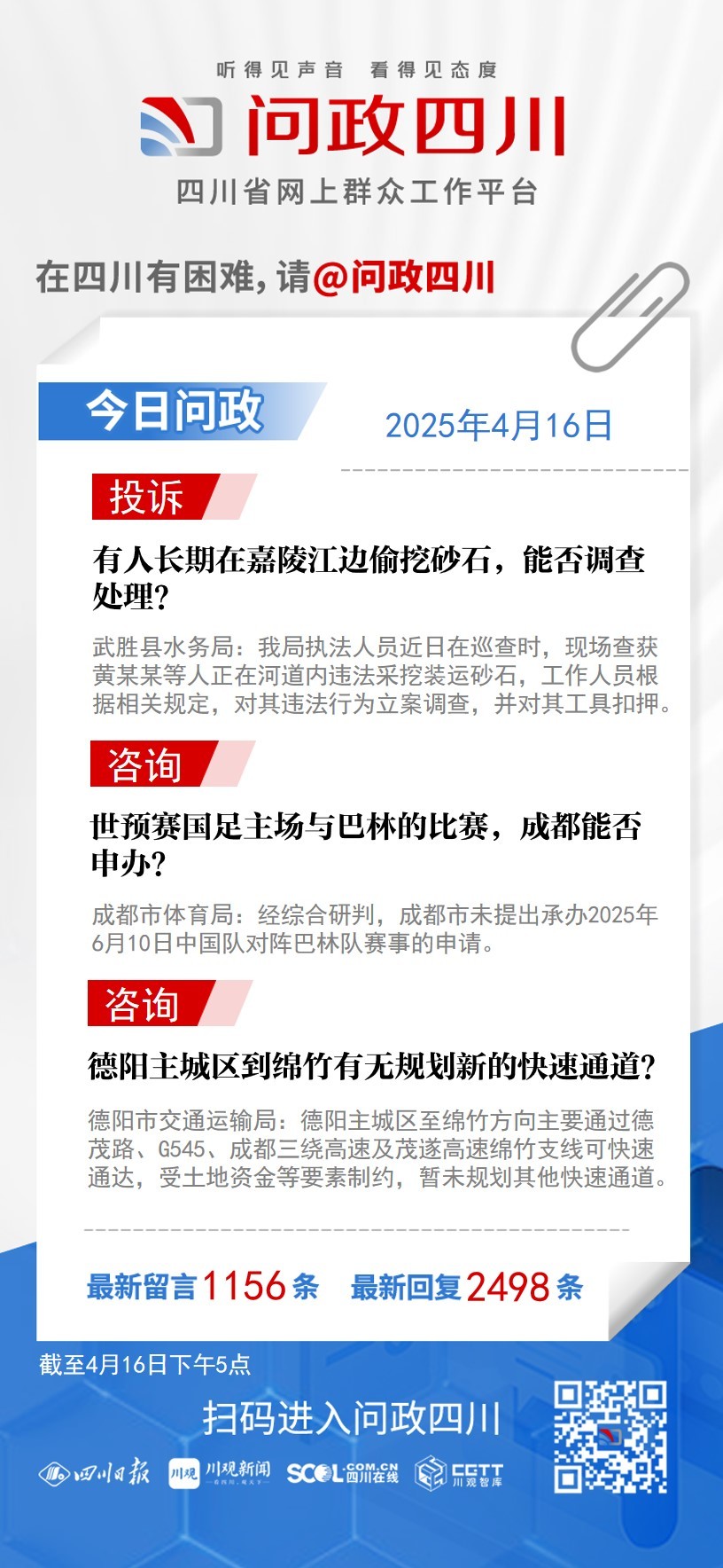 在四川有困难,找问政四川。如果您在四川遇到了操心事、烦心事、揪心事,请登录“四川省网上群众工作平台—问政四川”或拨打问政四川热线(028-96001)留言反映、求助或建议。我们将充分发挥平台的互动联系作用及舆论监督功能,第一时间传递民声,推动问题得以及时解决——听得见声音,看得见态度。