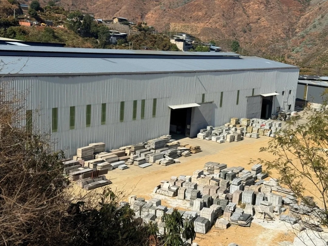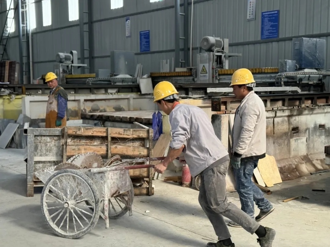 在0.5公里外的永胜村牛米塘组石材厂区,大量石材层层堆叠,颜色规格各异,或等待加工,或准备运输。大理石、花岗岩等各类石材有序陈列,打磨机高速运转着。