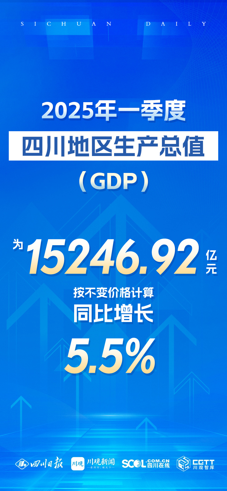 4月17日,记者从省政府新闻办召开的2025年一季度四川经济形势新闻发布会上获悉,根据地区生产总值统一核算结果,2025年一季度四川地区生产总值(GDP)为15246.92亿元,按不变价格计算,同比增长5.5%。