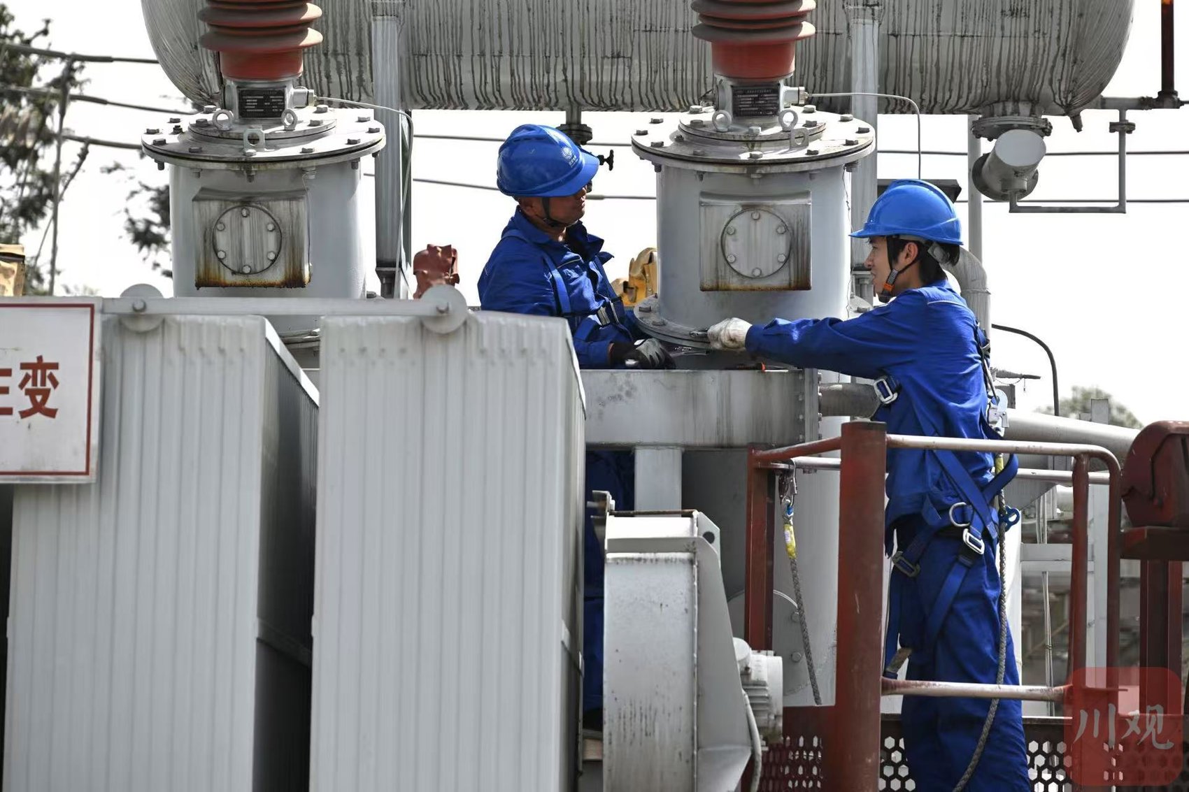 4月15日,“产业跃升中的工人力量”四川省总工会主题采访活动南线采访团走进国网乐山供电公司110kV平桥变电站时,多名电力工人正在进行定期检修及消缺、有载调压开关大修、引流线更换等工作。