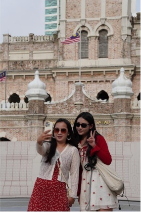 两名来自中国云南的游客在马来西亚首都吉隆坡地标性历史建筑苏丹阿卜杜勒·萨马德大厦前合影。人民日报记者 俞懿春摄