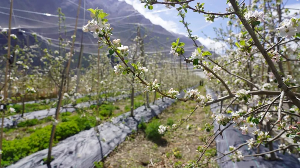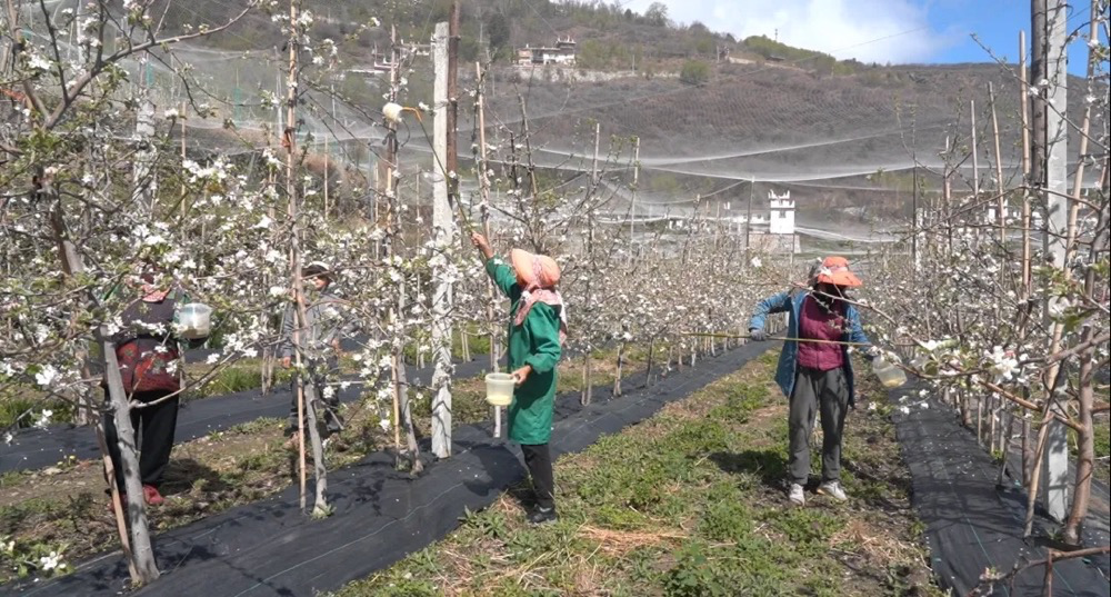 “近期持续阴雨导致昆虫活动减少,自然授粉率下降,我们立即启动人工授粉预案。”丹巴县农业技术推广研究员刘新丽介绍,通过精准调控授粉量,预计今年基地苹果产量将突破40万斤,果品品质与商品率将再创新高。说话间,她轻抚花枝,花瓣簌簌飘落,指尖已沾满春日的芬芳。