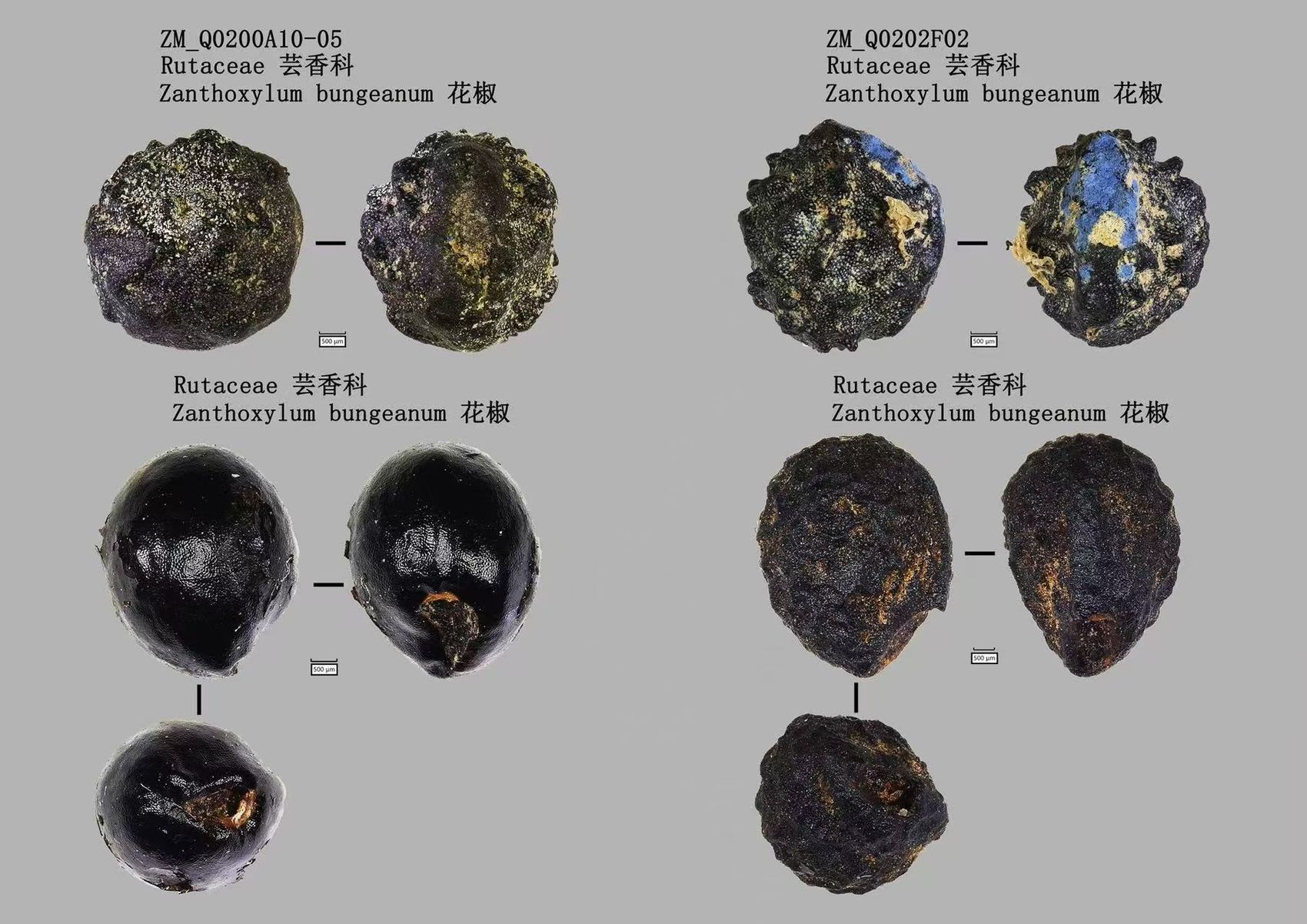 濛溪河出土花椒(上排4图)与现生种对比