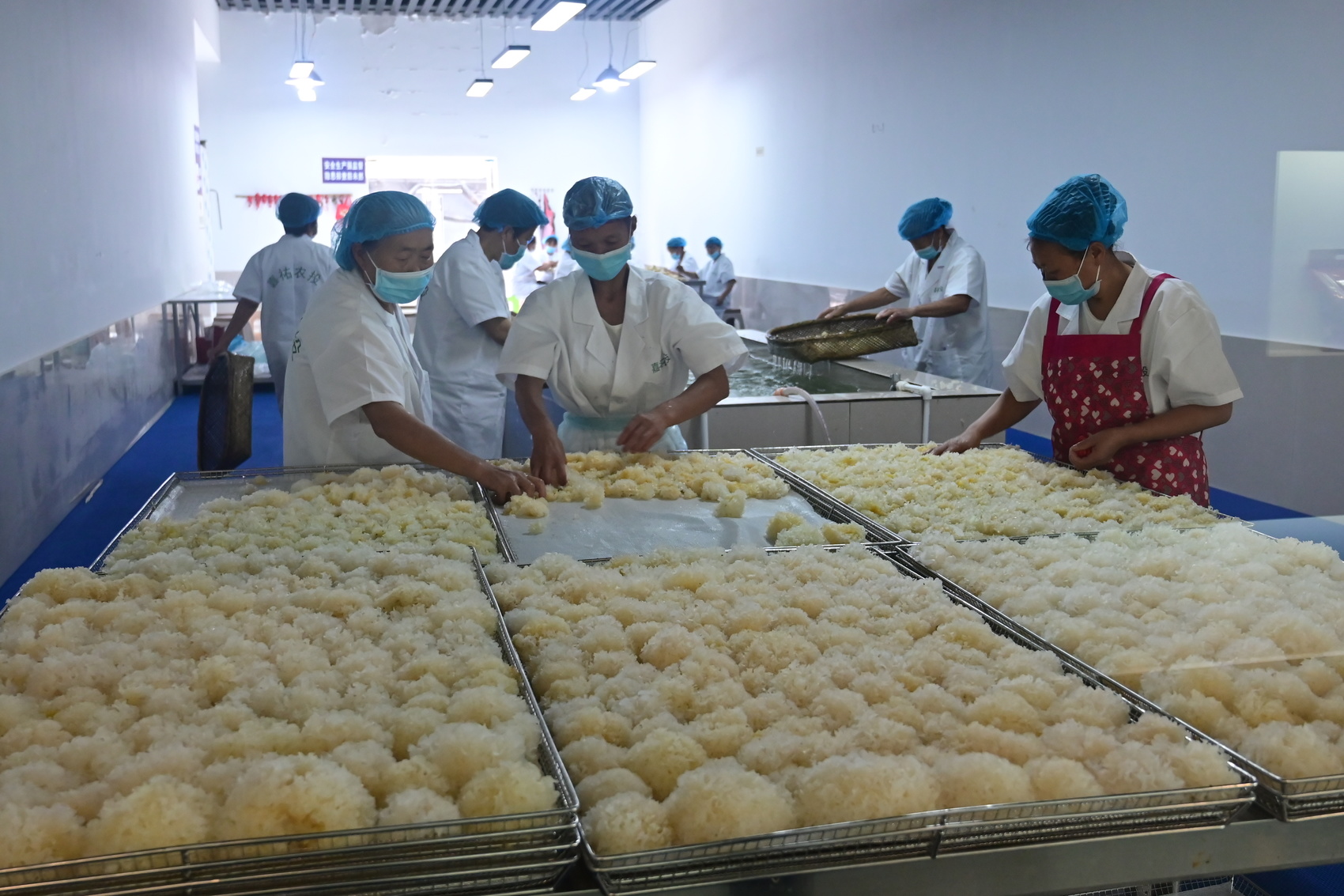 生产车间内,工人正在清洗刚采摘下来的银耳,准备深加工。 谭小龙 摄