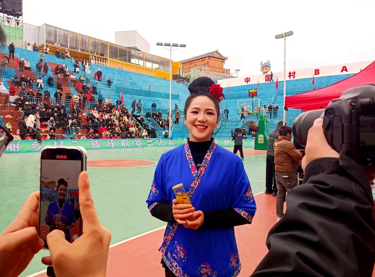 在贵州“村BA”赛场,通江银耳篮球队不仅上演精彩比赛,还带来银耳产品供观众品鉴。 杜文龙 摄