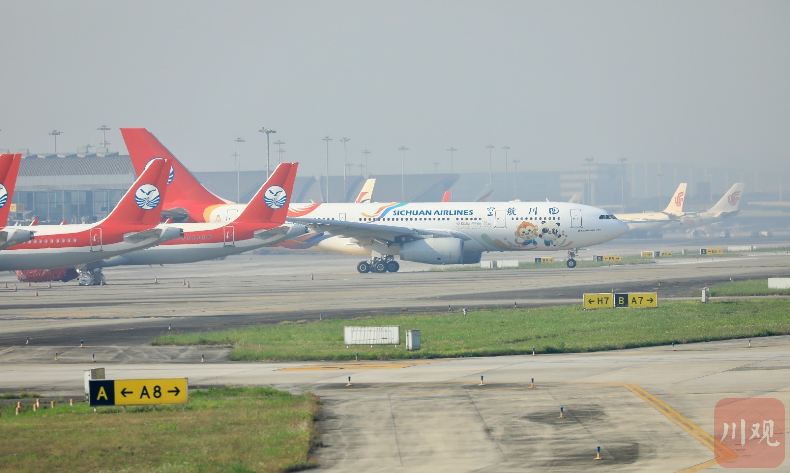 喷涂着“蜀宝”“锦仔”的空客A330宽体客机。戚原 摄
