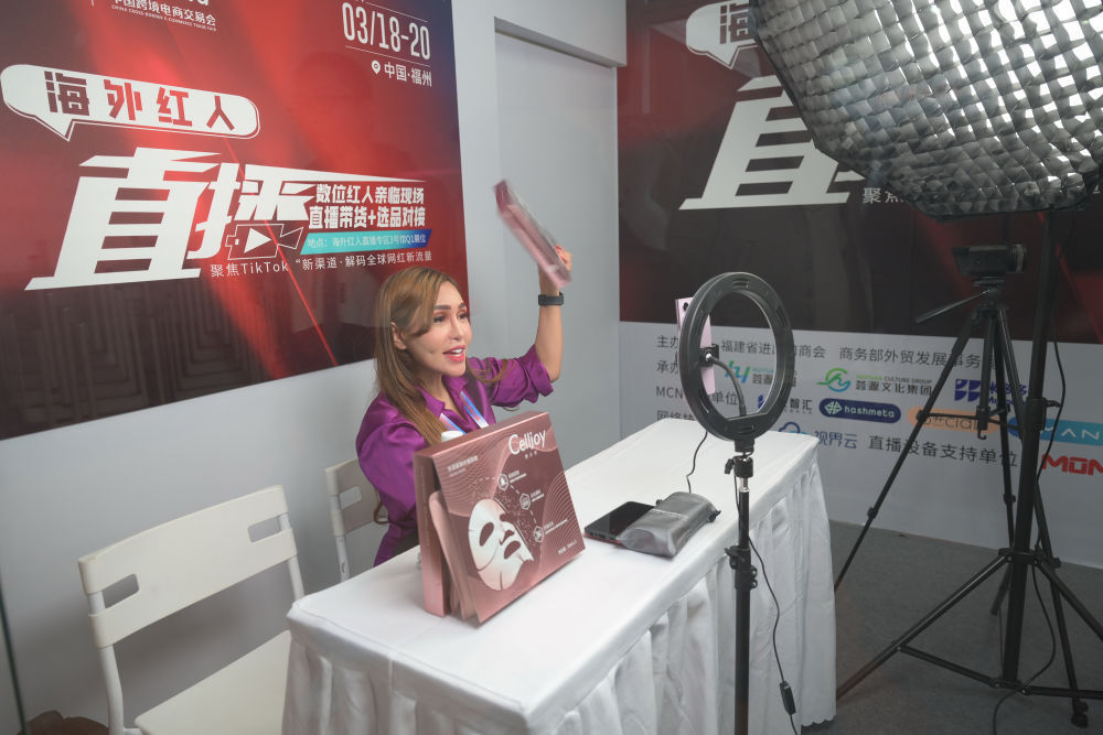 2024年3月18日,一名马来西亚主播在福建福州举行的第四届中国跨境电商交易会展会现场直播带货。