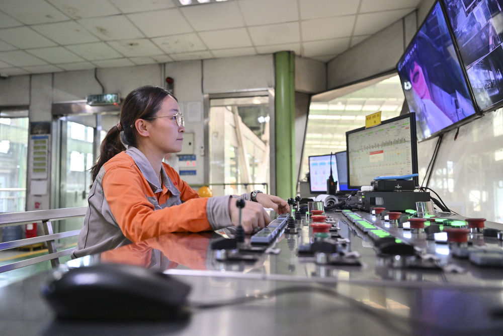 2024年6月13日,在马来西亚彭亨州马中关丹产业园联合钢铁(大马)集团公司工厂,中国员工在智能控制室工作。